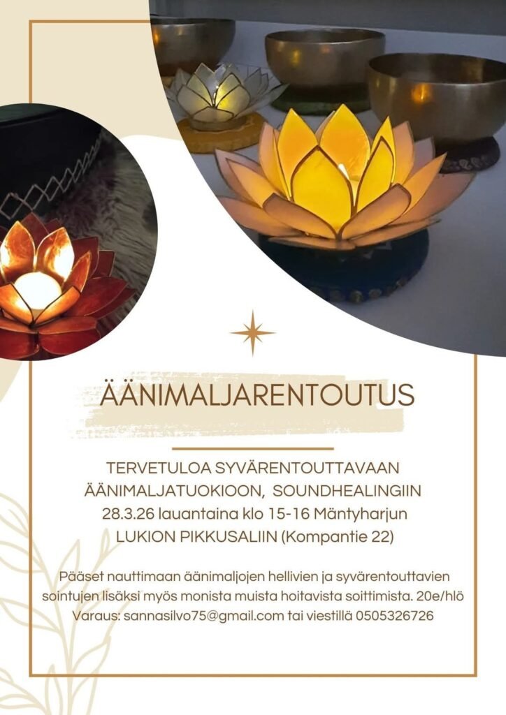 Äänimaljarentoutus 28.3.2026 Mäntyharjun lukion pikkusalissa klo 15-16. Tervetuloa rentoutumaan.